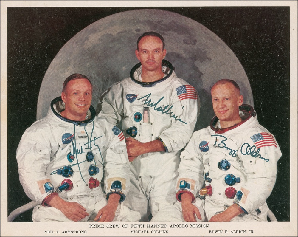 Color 10 x 8 NASA photo of the Apollo 11 crew posing together in their spacesuits against a lunar background, signed in black felt tip by Neil Armstrong, Mike Collins, and Buzz Aldrin. In fine condition, with paperclip impression to top edge, and some scattered light creases and surface marks. A cornerstone for any advanced space collection. Pre-certified Scott Cornish and RR Auction COA.
