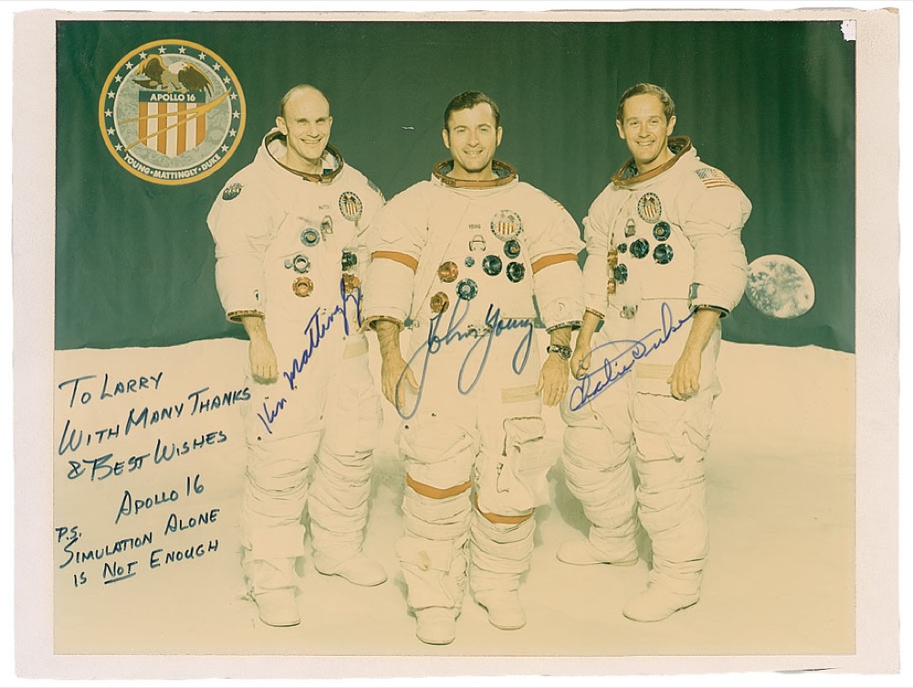Color satin-finish 9.5 x 7.5 color photo of the Apollo 16 crew standing in front of a lunar background with their mission logo, signed in blue felt tip by Ken Mattingly, John Young, and Charlie Duke, inscribed in blue felt tip by Young, “To Larry, with many thanks and best wishes, Apollo 16, Ps. Simulation alone is not enough.” Affixed to a 10.5 x 8.25 size mount. In very good condition, with cracking to emulsion throughout, emulsion missing from upper right corner tip, and slight fading to the image. Accompanied by a full letter of authenticity from Scott Cornish. Pre-certified Steve Zarelli and RR Auction COA.