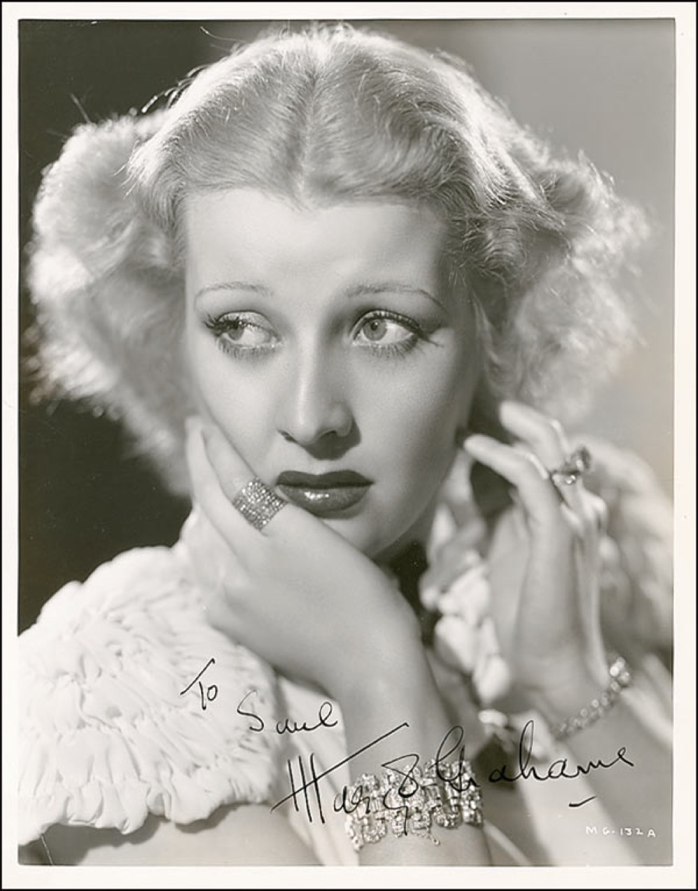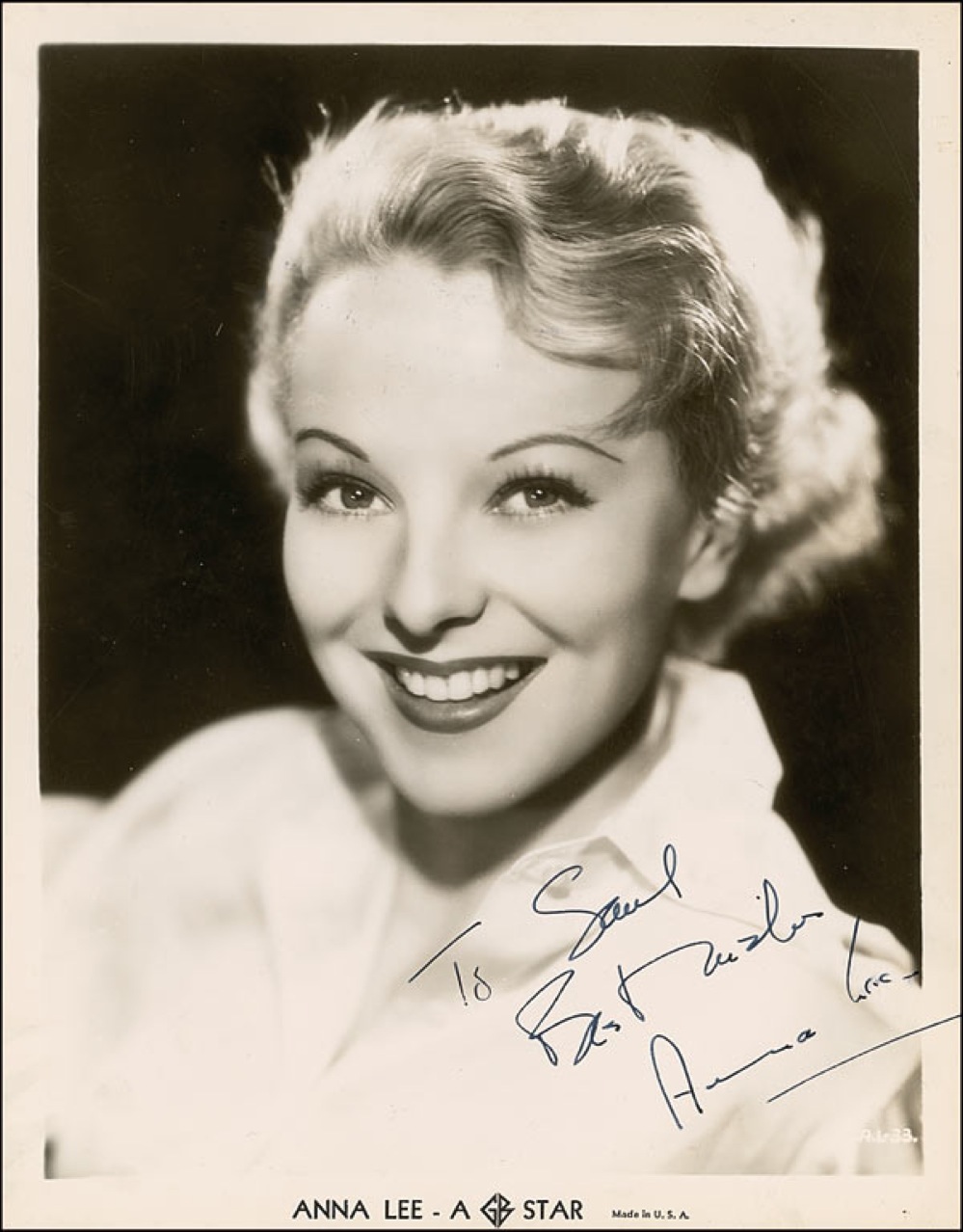 Three vintage 8 x 10 publicity photos: Radio Pictures glossy photo, signed and inscribed in-person in fountain pen “To Saul, Margot Grahame.” Reverse of photo bears collector’s stamp date of November 2, 1936; GB glossy photo, signed and inscribed in-person in fountain pen “To Saul, Best wishes, Anna Lee.” Reverse of photo bears collector’s ink date notation of February 28, 1943; pearl-finish double weight MGM publicity photo, signed and inscribed in-person in fountain pen “To Saul–Best wishes, Jean Rogers.” Reverse of photo bears collector’s stamp date of May 2, 1942. Each date reveals when the signature was acquired. Scattered creasing, light rippling, surface marks and rubs, and a couple fingerprints and a bit of scattered light silvering to the Rogers photo, otherwise fine condition. Saul Goodman Collection. RRAuction COA.