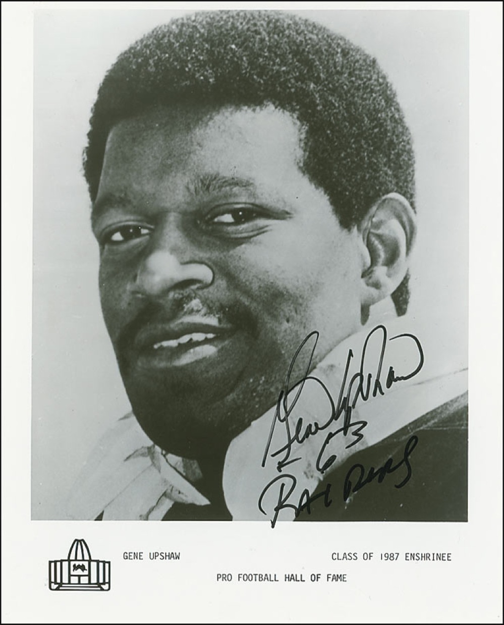 Three glossy 8 x 10 photos, one of which is a Hall of Fame enshrinement photo, each signed in black felt tip by the respective player pictured. Signers are: Joe Greene, Mike Singletary (adding “#50”), and Gene Upshaw (adding “#63, Raiders”). In overall fine condition, with a few creases to the Greene photo. RRAuction COA.