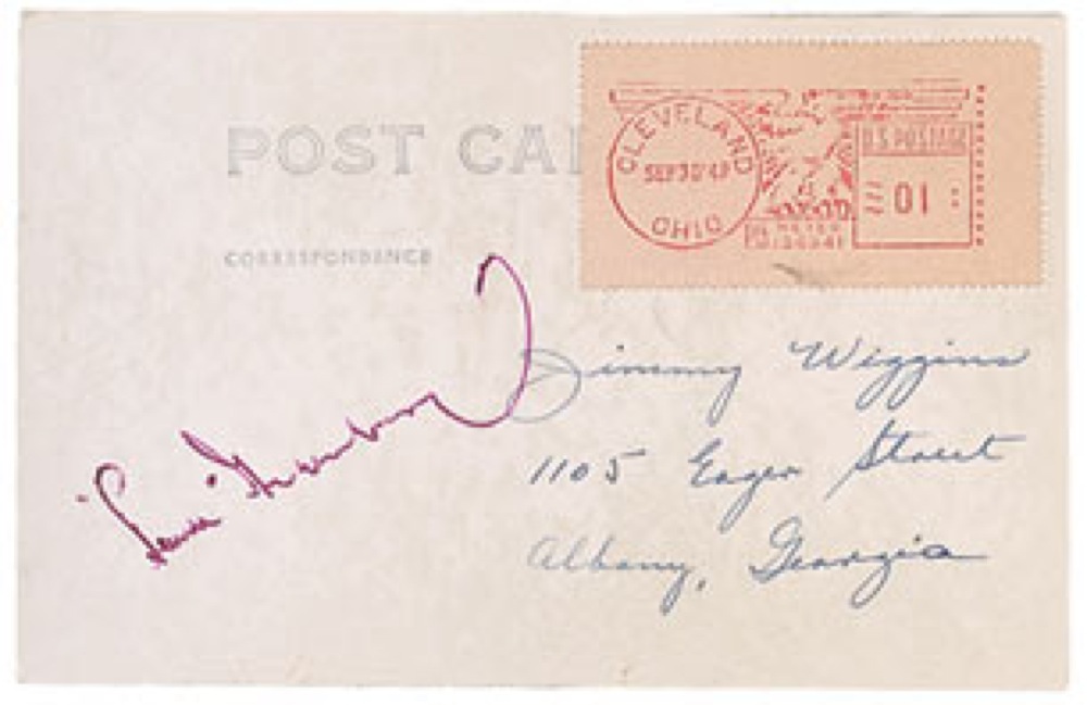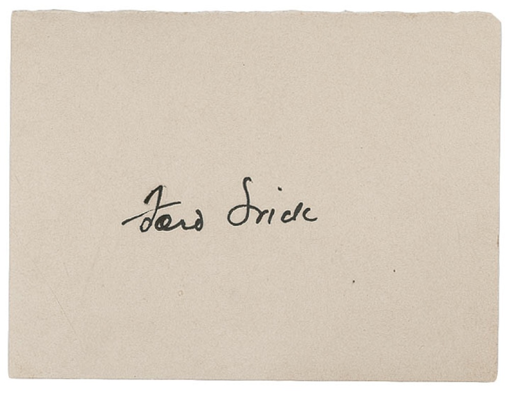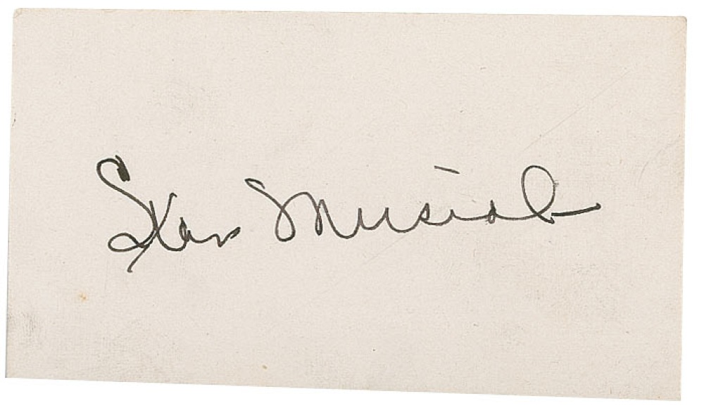 Three items: two vintage fountain pen signatures, “Stan Musial” and “Ford Frick,” on individual 3.5 x 2 and 4 x 3 off-white cards; and a vintage 3.5 x 5.5 photo postcard signed on the reverse in fuchsia fountain pen, “’Hank’ Greenberg.” In overall fine condition with light toning. RRAuction COA.