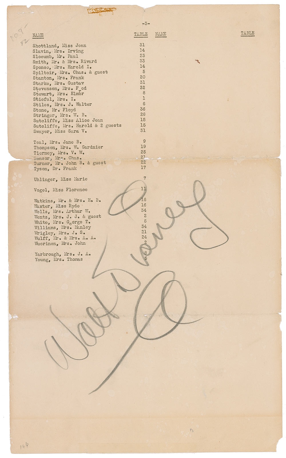Bold pencil signature, “Walt Disney,” on an off-white 8.5 x 14 sheet of seating assignments from an event. In very good condition, with horizontal fold passing through his first name and paraph, scattered tears and separation along the folds, uniform toning, adhesive staining at the extreme top edge and the end of his name overlapping printed text. Disney’s signature stretches 7.5 inches across the page! Pre-certified PSA/DNA and RR Auction COA.