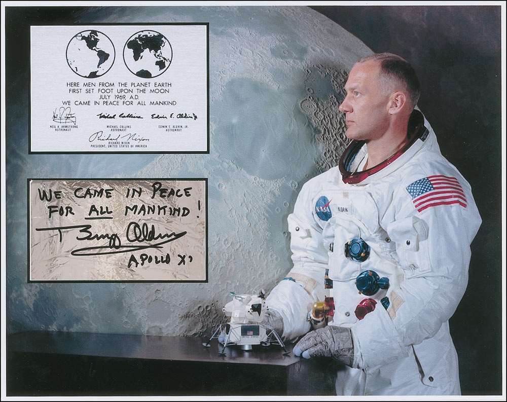 AQS on a 3.5 x 2 silver card. Aldrin writes, “We came in peace for all mankind! Buzz Aldrin Apollo XI.” Card is dry mounted to a 10.5 x 8.5 color montage of Aldrin in his space suit and the lunar plaque from where the quote originated. In very fine condition. Pre-certified Scott Cornish and RR Auction COA.
