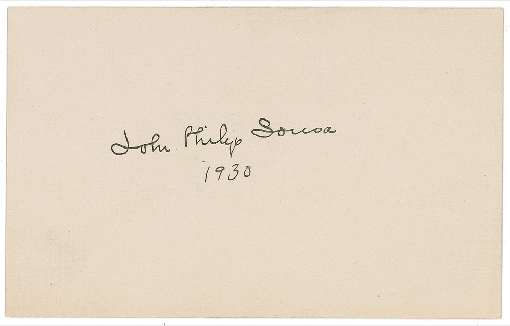Crisp ink signature, “John Philip Sousa 1930,” on an off-white 5 x 3 card. In fine condition, with a uniform shade of mild toning. Pre-certified PSA/DNA and RR Auction COA.