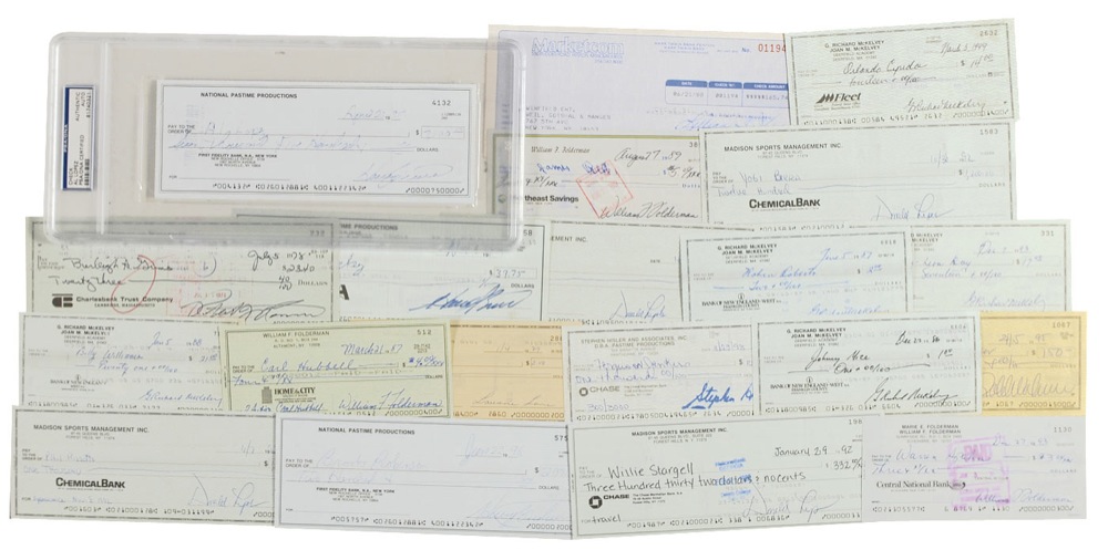 Twenty endorsed checks, all measuring from 6 x 3 to 8.5 x 3.5, all dating from the late 1970s to early 1990s, each endorsed on the reverse by a different Hall of Famer. Signers are: James Bell (also signed on the payee line), Yogi Berra, Orlando Cepeda, Leon Day, Bill Dickey, Burleigh Grimes, Carl Hubbell, Fergie Jenkins, Al Kaline, Bob Lemon, Al Lopez, Johnny Mize, Hal Newhouser, Phil Rizzuto, Robin Roberts, Brooks Robinson, Warren Spahn, Willie Stargell, Billy Williams, and Dave Winfield. A PSA/DNA authentication sticker is affixed to the reverse of the Bell, Hubbell, and Spahn checks with accompanying certificates of authenticity from PSA/DNA. The Lopez check is encapsulated in a plastic PSA/DNA authentication holder. Stamps to both sides, affecting some of the endorsements, and scattered creasing, otherwise overall fine condition. RRAuction COA.