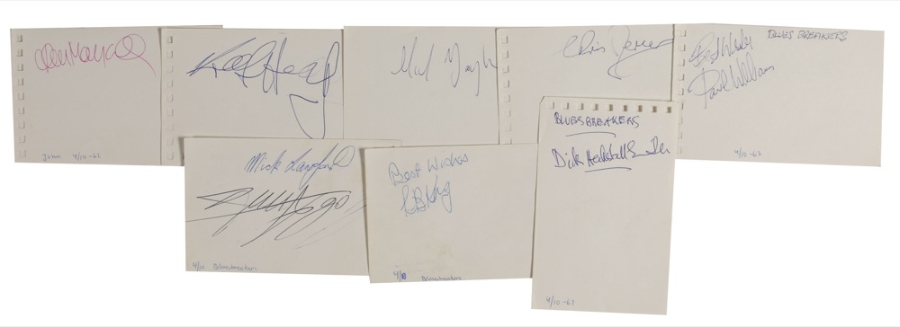 Eight ink signatures of John Mayall’s Bluesbreakers members on seven individual off-white 5 x 3.25 sheets. Signers are: John Mayall, Mick Taylor, Keef Hartley, Chris Mercer, Dick Heckstall-Smith, and three others. Accompanied by a ballpoint signature of B. B. King. In overall fine condition with a few scattered stains and collector notations. RRAuction COA.