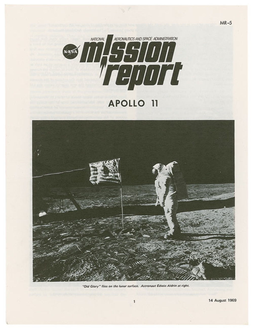 Apollo 11 mission report, 8 x 10.5, 8 pages, issued by NASA, dated August 14, 1969, and numbered in the top right corner of the cover “MR-5.” This abridged mission report details the highlights of the mission. In fine condition, with some scattered creases. RRAuction COA.