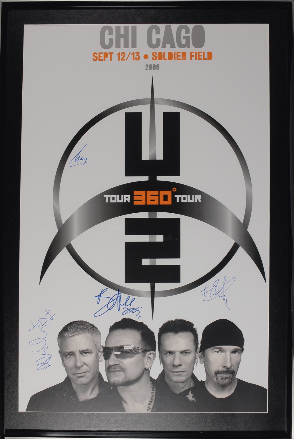 Awesome color 21 x 33 poster entitled for their September 12 and 13 Soldier Field 360° tour, signed in blue felt tip by Bono, The Edge, Adam Clayton, and Larry [Mullen]. Matted and framed to an overall size of 25 x 37. In fine condition. Oversized. Pre-certified Roger Epperson/REAL and RR Auction COA.