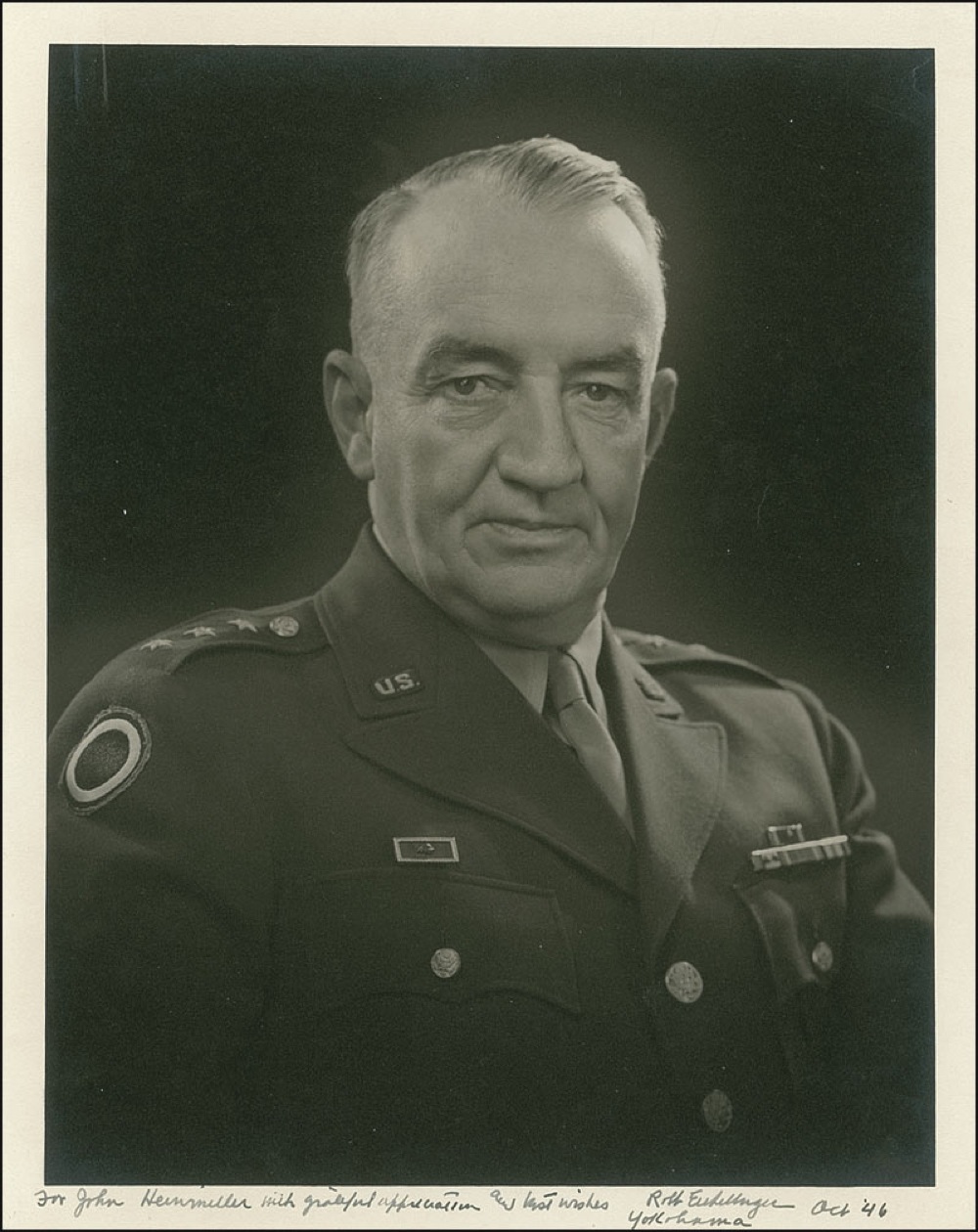General in the United States Army (1886–1961), who commanded the Eighth Army in the South West Pacific Area during World War II. Vintage matte-finish 8 x 10 photo, signed and inscribed in fountain pen “For John Heinmiller with grateful appreciation and best wishes, Robt. Eichelberger, Yokohama, Oct ’46.” In fine condition, with paperclip impression to top edge, a few scattered light surface creases, and some scattered light silvering to background. RRAuction COA.