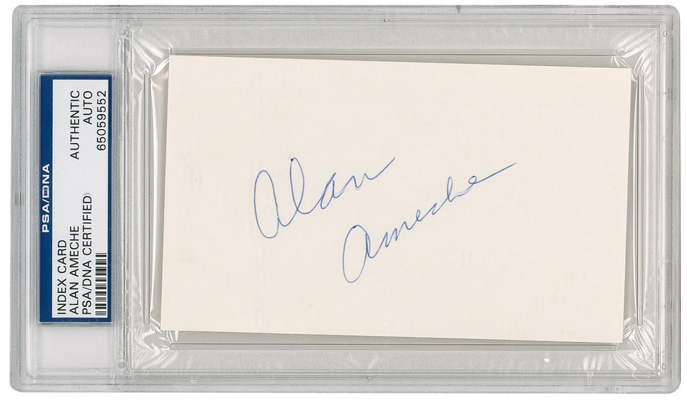 College Football Hall of Famer and Heisman trophy winner (1933–1988) best known for his role in the 1958 NFL championship game known as ‘The Greatest Game Ever Played.’ Ameche scored the winning touchdown for the Colts on a one-yard run in overtime as the Colts beat the Giants 23–17. Ballpoint signature, “Alan Ameche,” on an off-white 5 x 3 card. Encapsulated in a plastic PSA/DNA authentication holder. In fine condition. RRAuction COA.