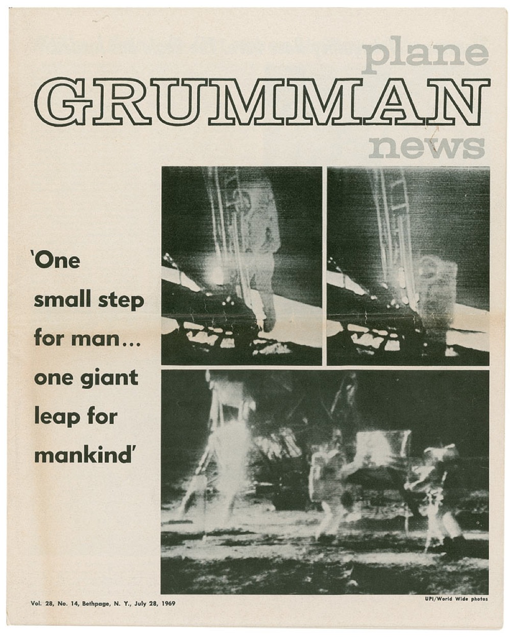Grumman Plane News, 10.5 x 13.25, 15 pages, issued on July 28, 1969. Cover features Neil Armstrong’s historic first steps on the moon as well as his famous quote. Inside has photos and articles about various Grumman projects and employees. In fine condition, with scattered toning and soiling, and a central horizontal fold. RRAuction COA.