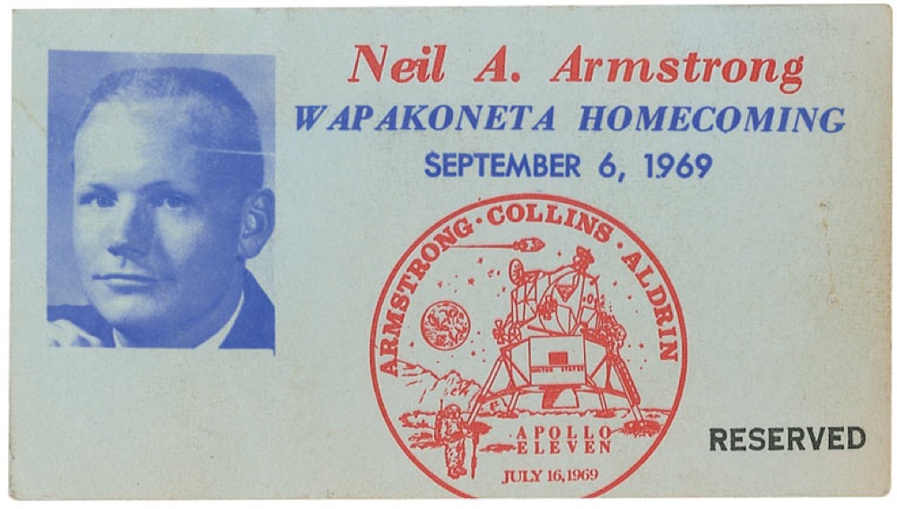 Original ‘reserved’ homecoming card, 4.25 x 2.5, for Neil Armstrong’s Wapakoneta Homecoming on September 9, 1969. Card features an image of Armstrong and an insignia commemorating the Apollo 11 mission. In fine condition, with staple hole to right edge, scattered mild toning, and light handling wear. More than 80,000 supporters greeted Armstrong upon his return to his hometown, and Bob Hope served as marshal for the event. RRAuction COA.