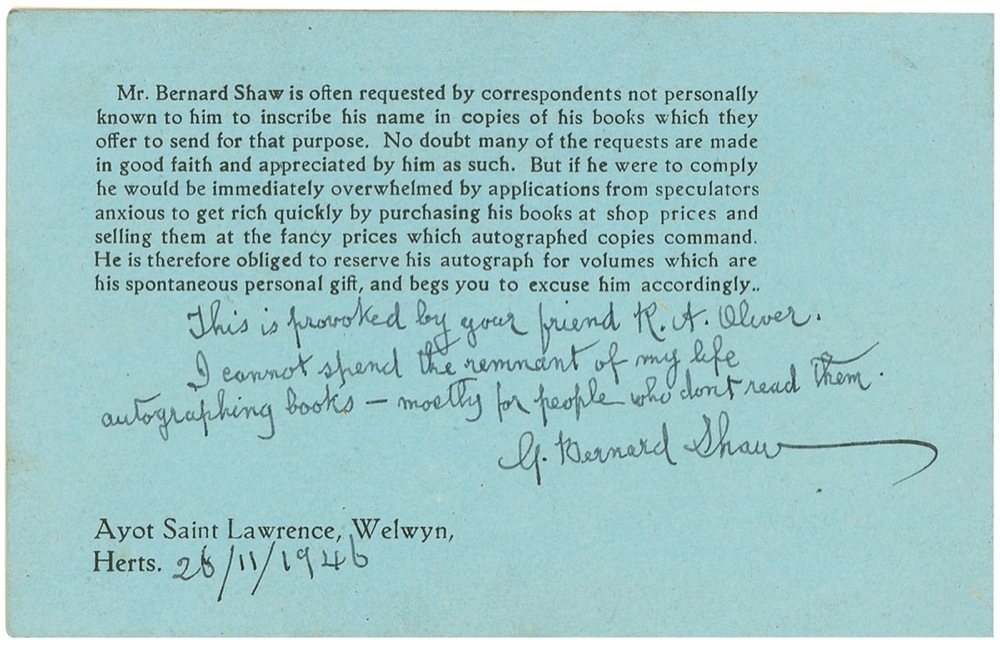 George Bernard Shaw: “I cannot spend the remnant of my life autographing books—mostly for people who don’t read them”