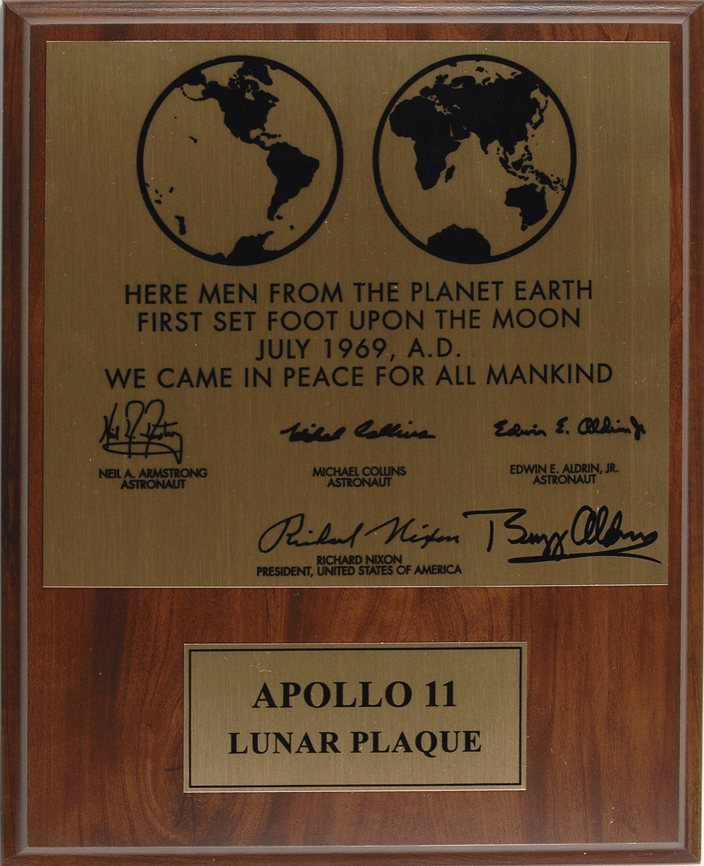 Replica 10.5 x 13 plaque honoring the crew of the Apollo 11 mission. The plaque reads “Here men from the planet Earth first set foot upon the moon July 1969, A. D. We came in peace for all mankind.” The plaque carries facsimile signatures of all three crew members and of Richard Nixon, and has also been signed in black felt tip by Aldrin in the lower right corner. In very fine condition. Accompanied by a letter of authenticity from Scott Cornish. RRAuction COA.
