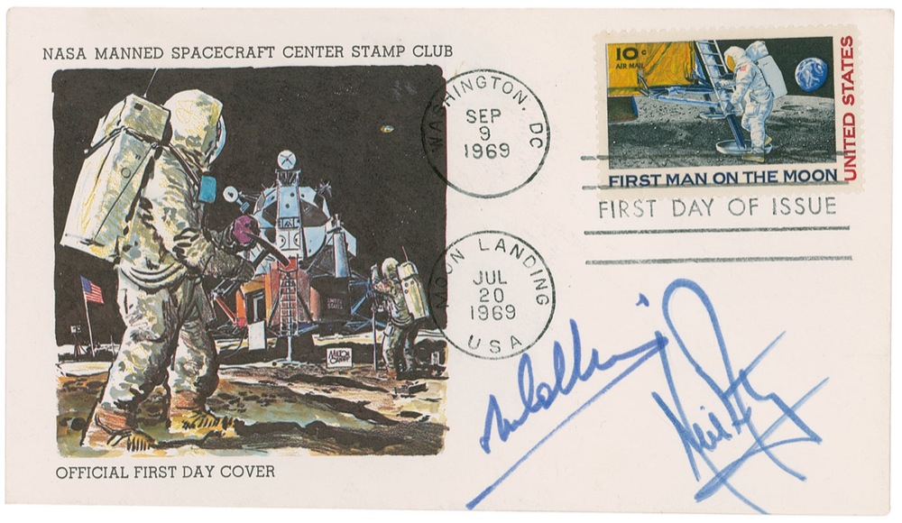 FDC honoring the first lunar landing, nicely signed in blue felt tip by Neil Armstrong and Michael Collins. Cover also bears a first man on the moon postage stamp with double cancellations of July, 20, 1969 and September 9,1969. In fine condition. Accompanied by a handwritten note from the original owner apologizing for only being able to get Armstrong’s and Collins’s signatures. Pre-certified Scott Cornish and RR Auction COA.