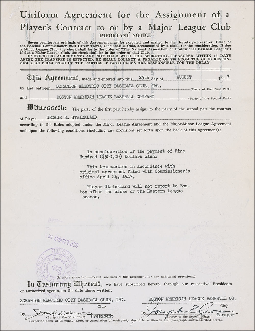 DS, signed “Joseph E. Cronin,” one page, 8.5 x 11, August 25, 1947. Agreement between the Red Sox and the Scranton Electric City Baseball Club, assigning Paul Strickland to Scranton in exchange for $500 cash. Signed at the bottom by Cornin as the club’s manager. In fine condition, with staple hole to top left corner and a James Spence authentication label affixed to lower corner of reverse. Accompanied by a certificate of authenticity from James Spence. Pre-certified Steve Grad/PSA/DNA and RR Auction COA.