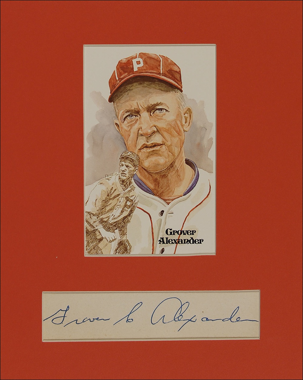 Ballpoint signature, “Grover C. Alexander,” on an off-white 5.5 x 1.25 slip. Matted with a Perez-Steele card to an overall size of 8 x 10. In fine condition. Pre-certified Steve Grad/PSA/DNA and RR Auction COA.