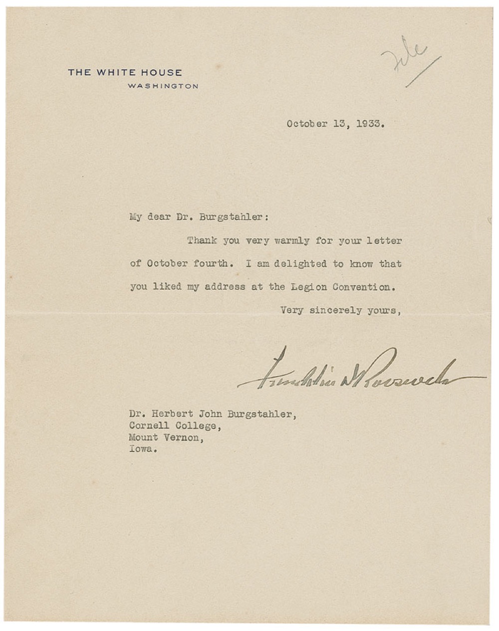 TLS as president, one page, 7 x 9, White House letterhead, October 13, 1933. The president writes Dr. Herbert John Burgstahler at Cornell College in Iowa. In full: “Thank you very warmly for your letter of October fourth. I am delighted to know that you liked my address at the Legion Convention.” Uniform toning, creasing, and an office notation in pencil at the upper right corner, otherwise fine condition. Pre-certified John Reznikoff/PSA/DNA and RR Auction COA.