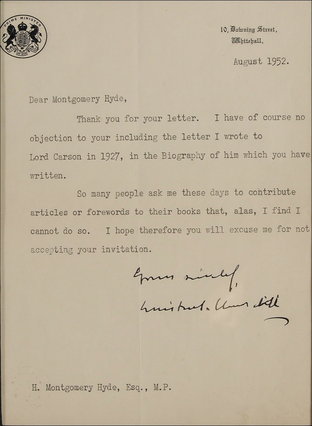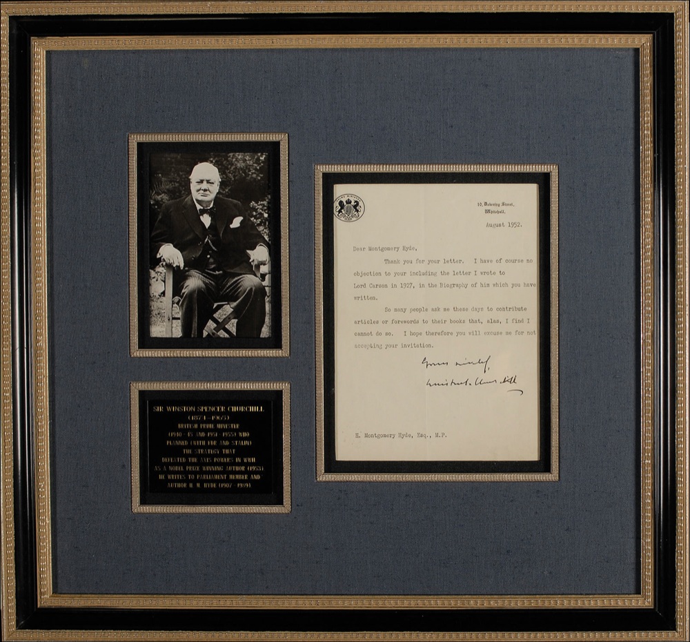 TLS signed “Yours sincerely, Winston S. Churchill,” one page, 6.5 x 9, 10 Downing Street letterhead, August 1952. Letter to author and member of Parliament H. M. Hyde. In full: “Thank you for your letter. I have of course no objection to your including the letter I wrote to Lord Carson in 1927, in the Biography of him which you have written. So many people ask me these days to contribute articles and forewords to their books that, alas, I find I cannot do so. I hope therefore you will excuse me for not accepting your invitation.” Double cloth matted and framed with a seated portrait of Churchill and a name plaque to an overall size of 22 x 20.5. In fine condition, with a bit of scattered light toning and soiling, and light mirroring of letterhead along bottom edge. Written during his second term as prime minister, Churchill is referencing Hyde’s 1953 biography, The Life of Sir Edward Carson, Lord Carson of Duncairn, concerning the prominent ‘uncrowned king’ of the Irish Protestant’s with whom he had a long friendship. Pre-certified John Reznikoff/PSA/DNA and RR Auction COA.