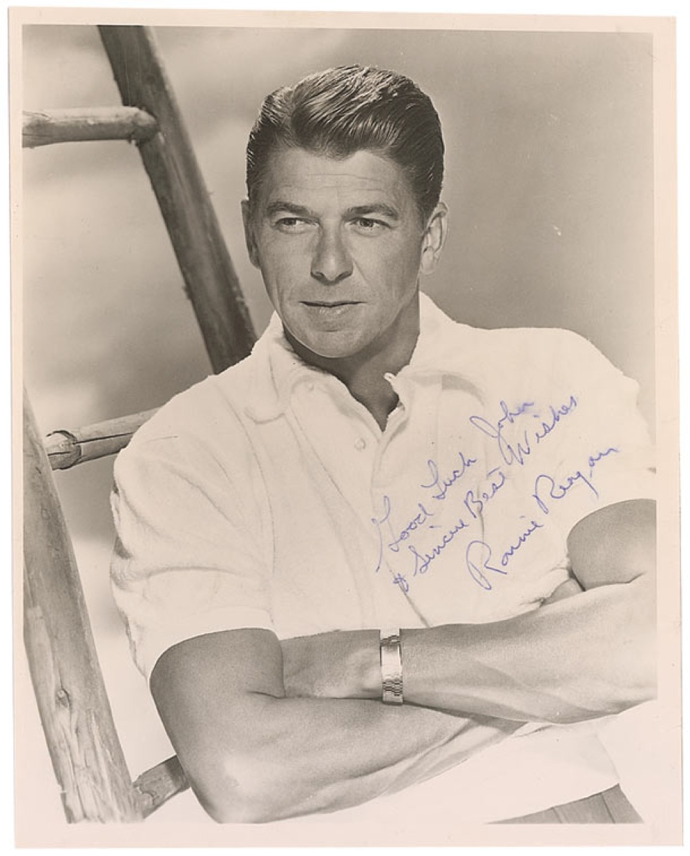 Vintage matte-finish 8 x 10 photo of Reagan leaning against a ladder, signed and inscribed in blue ballpoint “Good luck John & sincere best wishes, Ronnie Reagan.” Mild rippling from mounting remnants on reverse, and a couple slight brushes to signature and inscription, otherwise fine condition. Pre-certified PSA/DNA and RR Auction COA.