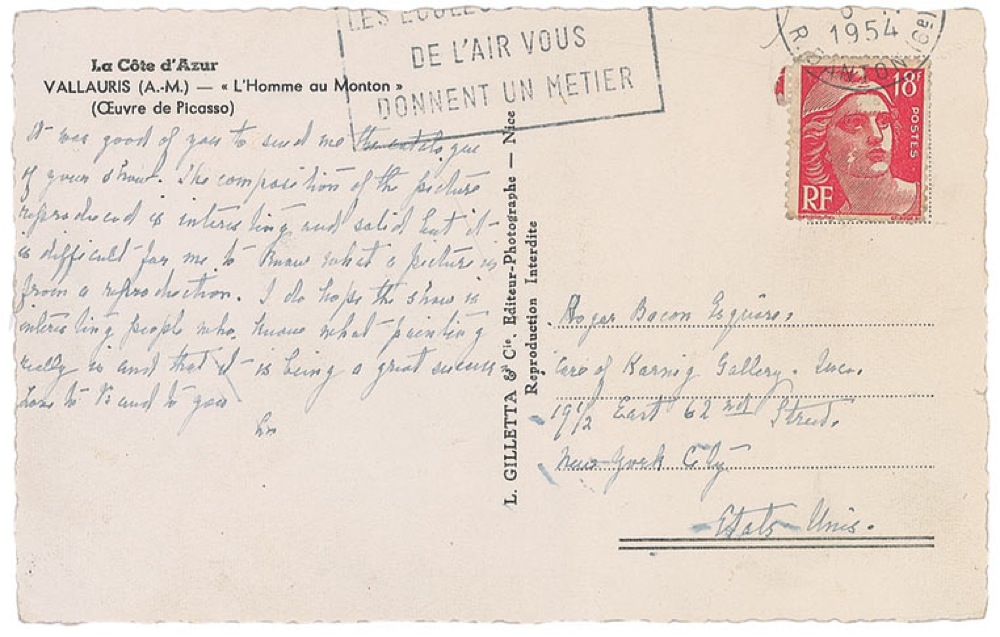Companion of writer Gertrude Stein, who wrote about their life together in What Is Remembered and was the subject of Stein’s Autobiography of Alice B. Toklas. ALS signed “A,” on the correspondence side of a 5.25 x 3.25 postcard, no date, but postmarked 1954. Letter to artist Roger Bacon. In part: “It was good of you to send me the catalogue of your show. The composition of the picture reproduced is interesting and solid but it is difficult for me to know what a picture is from a reproduction. I do hope the show is interesting…” Toklas has also addressed the postcard to Bacon. In fine condition, with scattered light toning and soiling and postal mark over a couple words of text. RRAuction COA.
