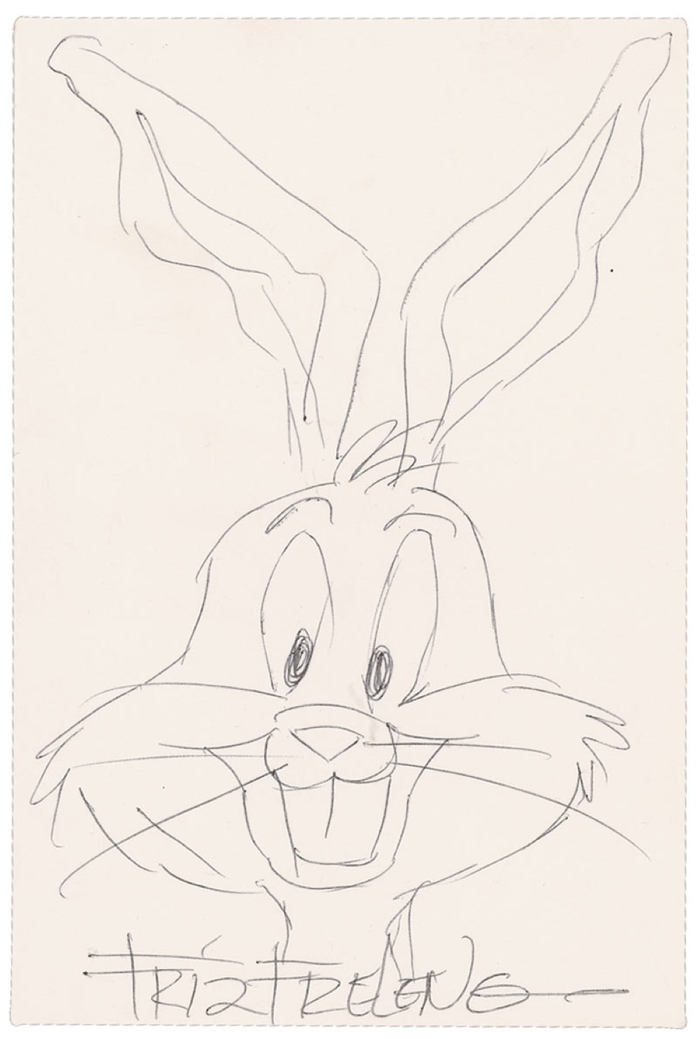 Original signed ballpoint sketch of Bugs Bunny on an off-white 4 x 6 card, signed along the bottom by Freleng. In fine condition. RRAuction COA.