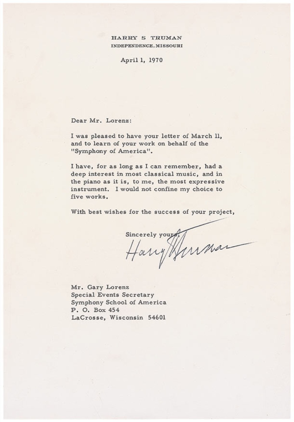 TLS, one page, 7.25 x 10.5, personal letterhead, April 1, 1970. Letter regarding his musical tastes. In part: “I was pleased…to learn of your work on behalf of the ‘Symphony of America.’ I have, for as long as I can remember, had a deep interest in most classical music, and in the piano as it is, to me, the most expressive instrument. I would not confine my choice to five works.” In fine condition. Pre-certified John Reznikoff/PSA/DNA and RR Auction COA.