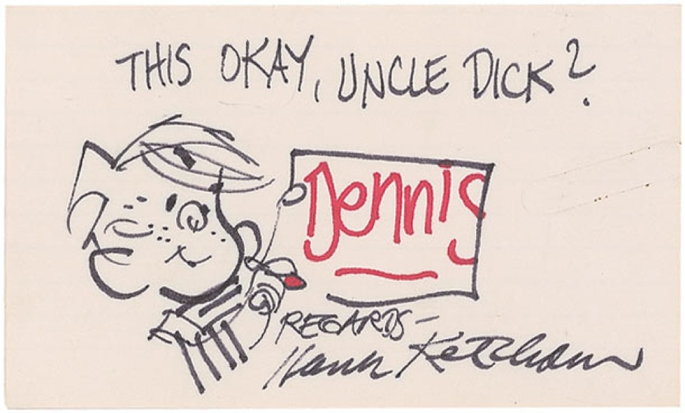 Two items: Original signed and inscribed felt tip sketch of Dennis the Menace on an off-white 5 x 3 card, “This okay, Uncle Dick? Regards-Hank Ketcham.” Signed comic book: Dennis the Menace-All Year ‘Round. No. 49, Fall, 1967. Signed on cover page in blue felt tip. Light paperclip impression to card, wear and scattered creasing to cover and spine, and uniform toning throughout, otherwise fine condition. RRAuction COA.