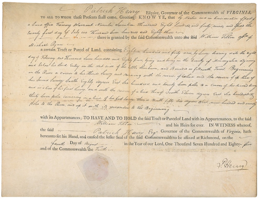 Partly-printed DS, signed “P. Henry,” one page, 16.25 x 12.5, August 4, 1785. Land grant issued by Henry, as governor of Virginia, to William Tilton for 1840 acres “by Survey…in the County of Monongalia (now West Virginia)…on the west side of the little Kenhawa (now Little Kanawha River)….” In very good condition, with intersecting folds, scattered toning, creasing, and soiling, and some light mirroring of ink from folding. The white paper seal is crisp and intact. This particular tract of land was originally located in 1771 by George Washington adding a unique and interesting association to the document. Pre-certified John Reznikoff/PSA/DNA and RR Auction COA.