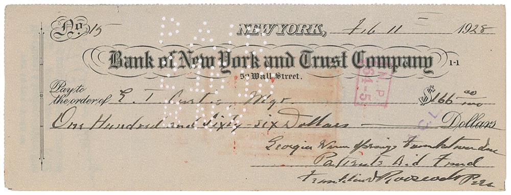 Bank of New York Company check, 8.25 x 3, filled out and signed by Roosevelt, “Georgia Warm Springs Foundation Patients Aid Fund, Franklin D. Roosevelt, Pres.,” made payable to E. T. Curtis, Manager, for $166.00, February 11, 1928. In very good condition, with expected bank stamps and cancellation holes, and show-through from a stamp on the reverse. To ensure that no one in need was ever turned away from his Warm Springs Institute for Rehabilitation, FDR established a Patients’ Aid Fund to provide financial assistance. When that fund was depleted, the future president ordered the bills of those patients who could not afford the cost be sent directly to him for payment. Pre-certified John Reznikoff/PSA/DNA and RR Auction COA.