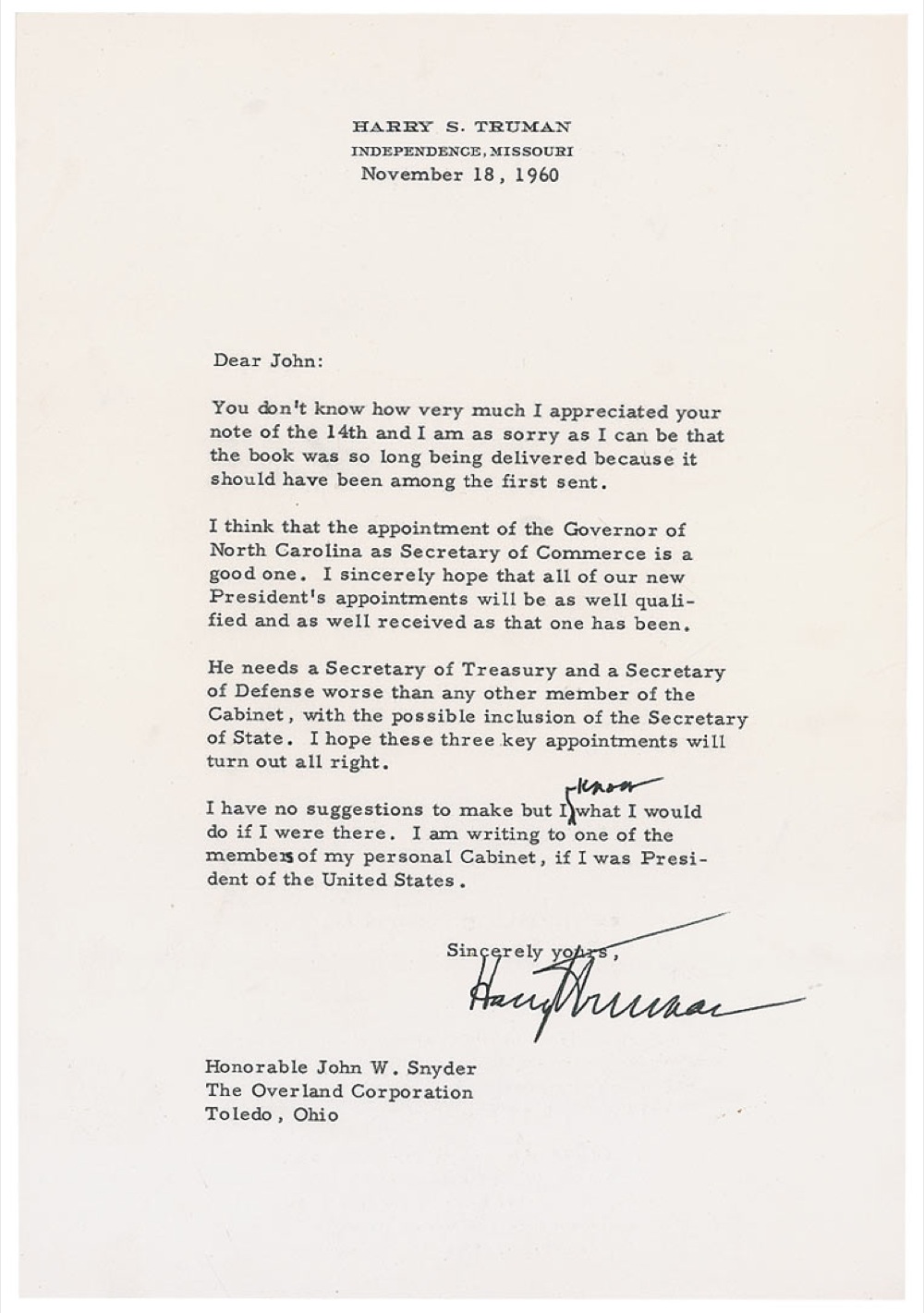 TLS, one page, 7.25 x 10.5, personal letterhead, November 18, 1960. Truman writes former Treasury Secretary John W. Snyder just ten days after JFK was elected. In part: “I think that the appointment of the Governor of North Carolina as Secretary of Commerce [Luther Hodges] is a good one. I sincerely hope that all of our new President’s appointments will be as well qualified and as well received as that one has been. He needs a Secretary of Treasury and a Secretary of Defense worse than any other member of the Cabinet, with the possible inclusion of the Secretary of State. I hope these three key appointments will turn out all right. I have no suggestions to make but I know what I would do if I were there. I am writing to one of the members of my personal Cabinet, if I was President of the United States.” Truman has made a one-word correction in his hand. In fine condition, with a few faint surface impressions and a small paperclip mark at the bottom left corner. Kennedy’s appointments included Secretary of State Dean Rusk and Secretary of Defense Robert McNamara, who would both play important roles in the administration, including the Cuban Missile Crisis in 1962, where the Cold War almost became a nuclear conflict. Pre-certified John Reznikoff/PSA/DNA and RR Auction COA.