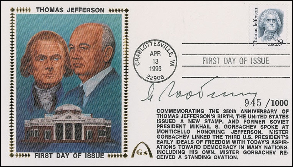 Limited edition Gateway FDC with a color silk cachet honoring Thomas Jefferson, #945/1000, signed in black ink. In very fine condition. RRAuction COA.
