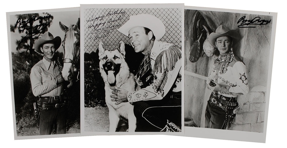 Three glossy 8 x 10 signed promotional photos of Rogers, Bullet, and Trigger, signed in black ink, “Happy Birthday, Happy Trails, Roy Rogers & Bullet;” in black felt tip, “Roy Rogers,” and “Roy Rogers, Trigger.” In overall fine condition, with some dark contrast to the signature of the photo with Trigger. RRAuction COA.