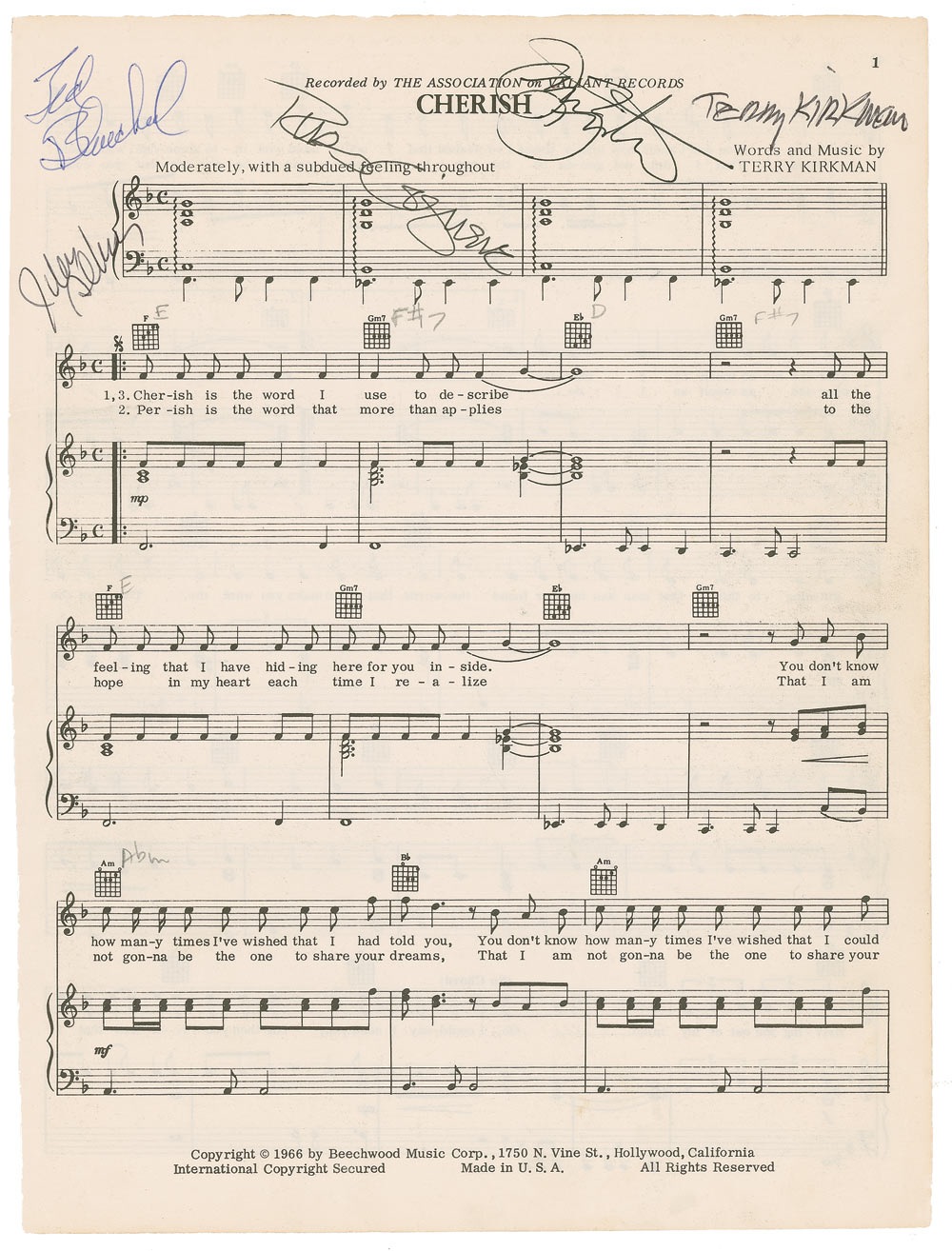 Sheet music, one page, both sides, 8.5 x 11, for the beginning of ‘Cherish,’ signed at the top in ballpoint by Terry Kirkman, Russ Giguere, Jim Yester, Ted Bluechel, and Jules Alexander. In fine condition, with a uniform shade of mild toning. RRAuction COA.