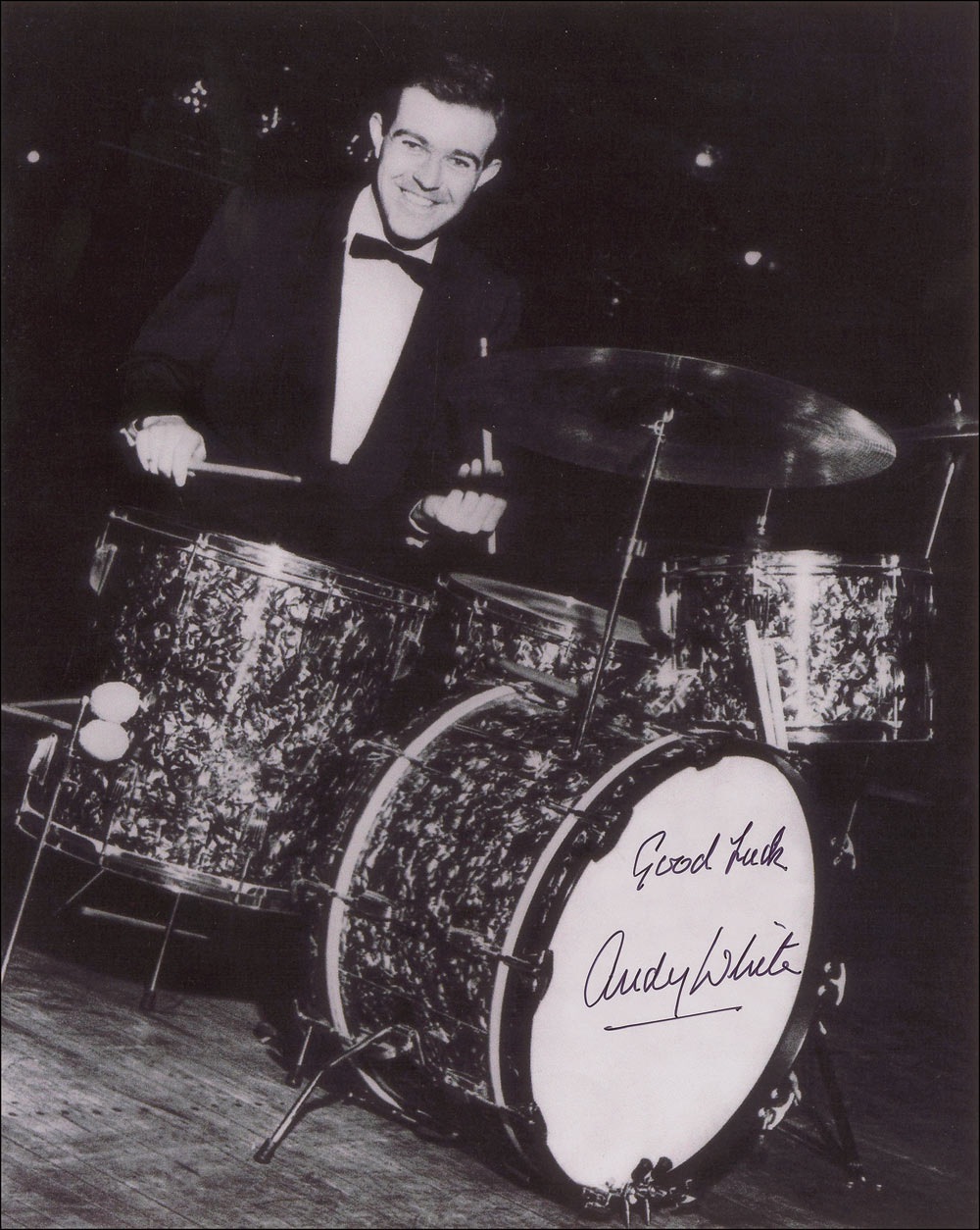 Drummer best known for replacing Ringo Starr on drums on The Beatles' first single, ‘Love Me Do.’ Glossy 8 x 10 photo of White behind his drum kit, signed in black felt tip, “Good luck, Andy White.” In very fine condition. RRAuction COA.