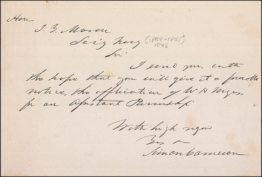 Lincoln’s controversial first secretary of war. ALS, one page, lightly-lined, 7.5 x 5.25, no date. Letter to Navy Secretary John Young Mason. In full: “I send you, with the hope that you will give it a favorable notice, the application of W. H. Myers from a Assistant Pursurship.” Letter is affixed to an identical size sheet. In very good condition, with central vertical fold, pencil notation near top, and scattered toning and soiling. RRAuction COA.
