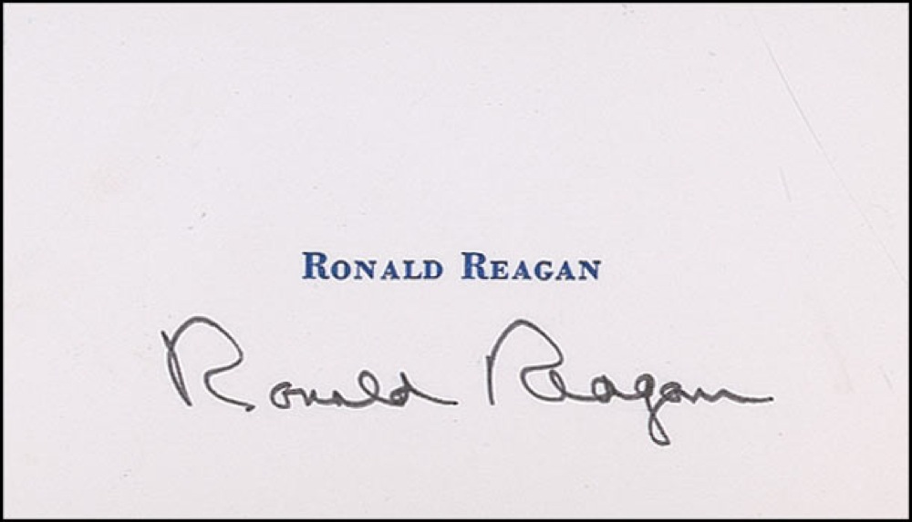 Two items: color cardstock 8 x 10 portrait signed and inscribed in black felt tip “To Charles—With Very Best Wishes & Regards—Ron”; and a white card, 3.5 x 2, with Reagan’s printed name and signed in black felt tip “Ronald Reagan.” In fine condition with some bends and small creases to the photo. RRAuction COA.