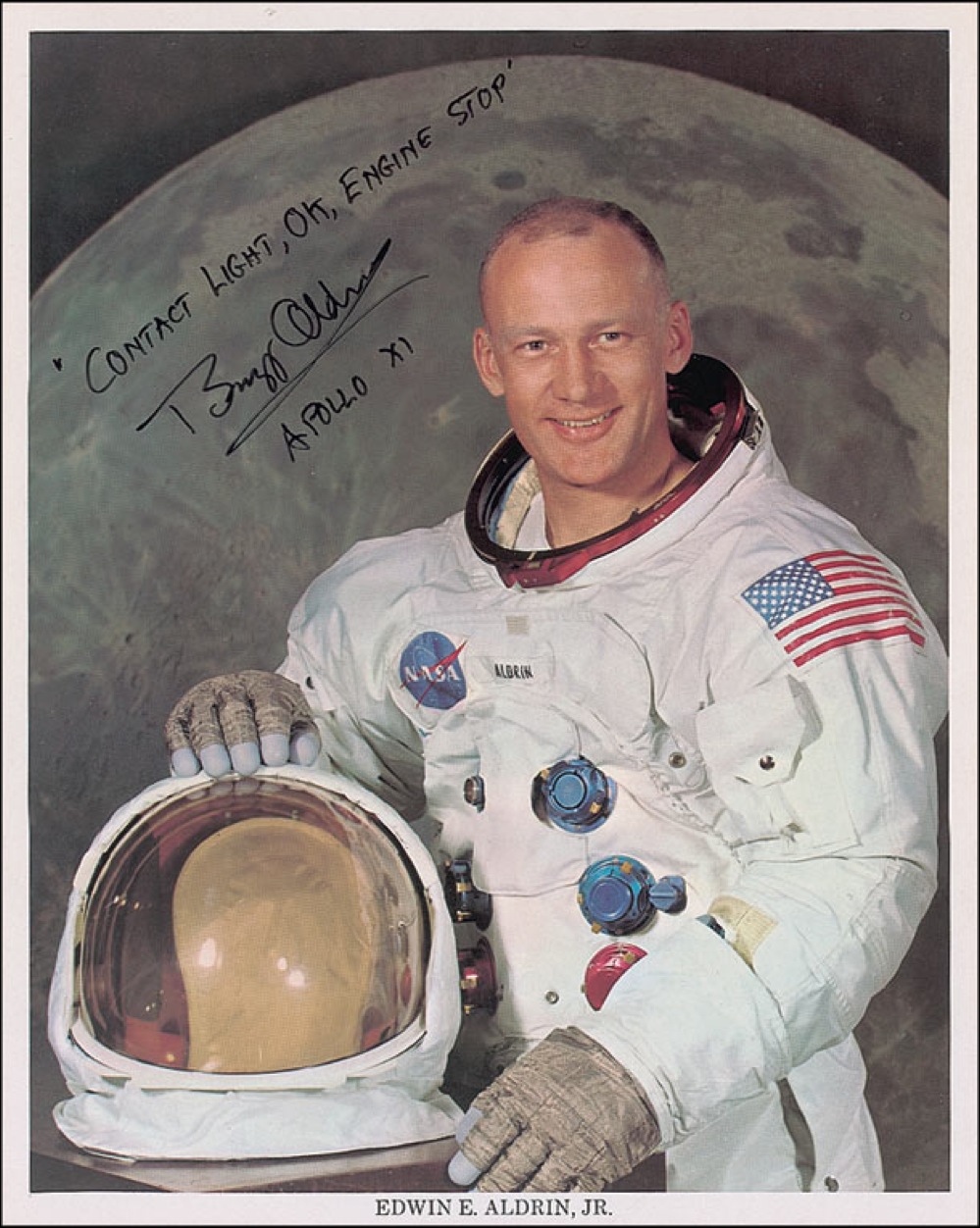 Color 8 x 10 NASA photo of Aldrin in his white spacesuit, signed in black felt tip “‘Contact Light, OK, Engine Stop.’ Buzz Aldrin, Apollo XI.” In fine condition. Pre-certified Scott Cornish and RR Auction COA.