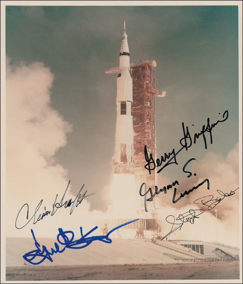 Color 8 x 10 NASA photo of an Atlas rocket at lift-off, signed in felt tip by Chris Kraft, Gene Krantz, Gerry Griffins, Glynn Lunney, and Stephen Bales. In fine condition. Pre-certified Scott Cornish and RR Auction COA.