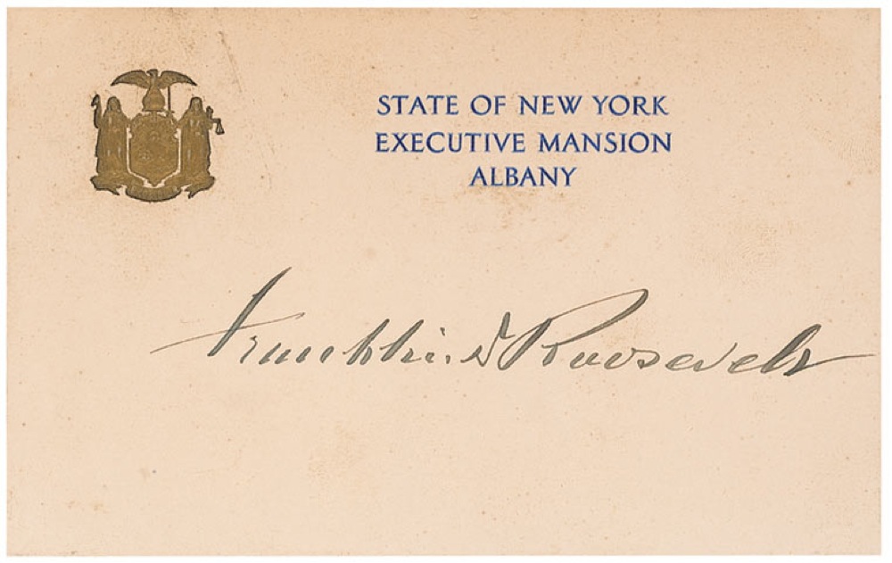 Fountain pen signature, “Franklin D. Roosevelt,” on an off-white 5 x 3.25 embossed State of New York Executive Mansion card. In very good condition, with uniform toning, paperclip impression to top edge, and scattered light foxing. Pre-certified John Reznikoff/PSA/DNA and RR Auction COA.