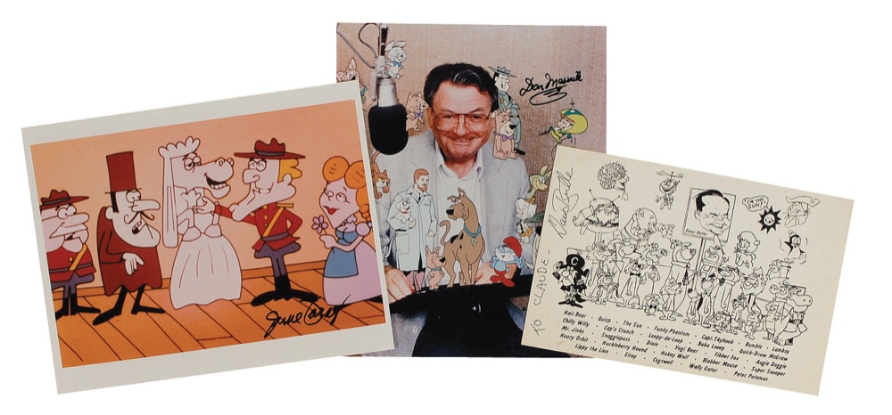 Three items: Color glossy 8 x 9.75 photo of Don Messick surrounded by the characters his voice brought to life, signed in black felt tip; a color glossy 10 x 8 image of characters from the Rocky and Bullwinkle Show signed in black felt tip by June Foray; and a 9 x 6 cardstock photo of a caricature of Daws Butler surrounded by the characters he voiced, signed and inscribed in black ink, “To Claude, Daws Butler.” In fine condition, with some light, scattered spots of soiling on the cardstock photo. RRAuction COA.