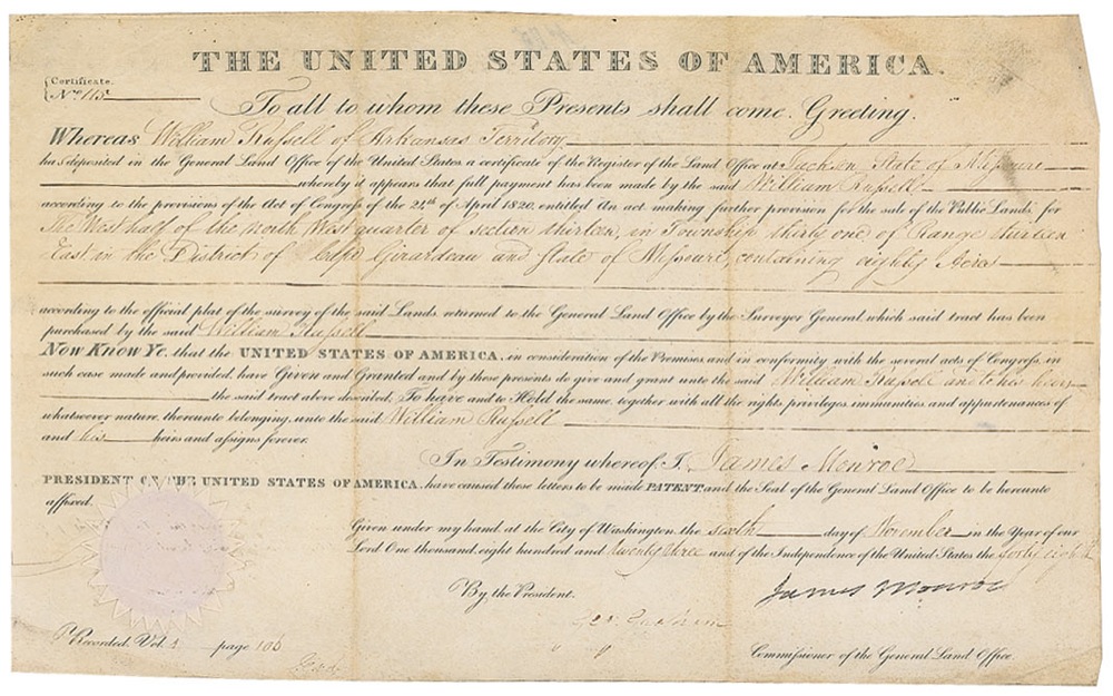 Partly-printed DS as president, one page, 15.5 x 9.5, November 6, 1823. Land grant issued to William Russell for 80 acres in the Arkansas territory, signed at the conclusion by Monroe and countersigned by Commissioner of the General Land Office George Graham. In very good condition, with two vertical folds, scattered creasing, soiling, and wrinkling, and Graham’s signature light, but mostly legible. The white wafer seal is worn, but intact. Pre-certified John Reznikoff/PSA/DNA and RR Auction COA.