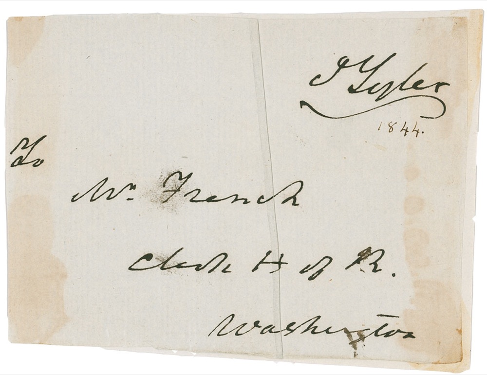 Hand-addressed and free franked address panel, 4 x 3, addressed by Tyler “To Mr. French, Clerk H. of R., Washington,” and franked in the upper right, “J. Tyler,” and dated 1844 under the signature in an unknown hand. Panel is affixed to a slightly larger sheet. In very good condition, with a complete central vertical separation, edge toning from adhesive on reverse, and a date notation of 1844 under signature in an unknown hand. Pre-certified John Reznikoff/PSA/DNA and RR Auction COA.
