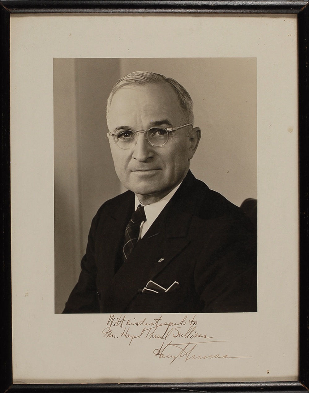 Vintage matte-finish 10.5 x 13.5 photo, signed and inscribed in the lower body in fountain pen “With kindest regards to Mrs. Hazel Thradl Sullivan, Harry S. Truman.” Framed to an overall size of 11.5 x 14.5. In fine condition, with some light edge creasing. Pre-certified John Reznikoff/PSA/DNA and RR Auction COA.