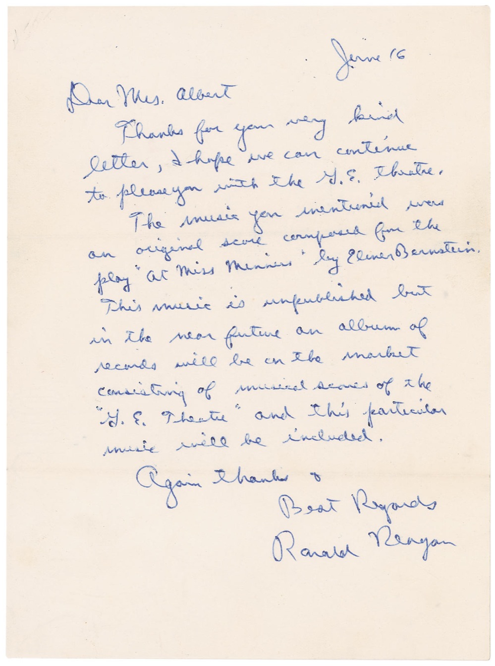 ALS, one page, 6 x 8.25, June 16. Letter to a fan. In full: “Thanks for your very kind letter, I hope we can continue to please you with the G. E. Theatre. The music you mentioned was an original score composed for the play ‘At Miss Minners’ by Elmer Bernstein. This music is unpublished but in the near future an album of records will be on the market consisting of musical scores of the ‘G. E. Theatre’ and this particular music will be included.” In fine condition. This particular show appeared on October 26, 1958 starring Isobel Elsom and Joan Fontaine. Reagan hosted 263 episodes of the G. E. Theatre television show from 1954-1962, in which many stars appeared, including his future wife Nancy Davis, James Stewart, Natalie Wood, and James Dean. Pre-certified PSA/DNA and RR Auction COA.