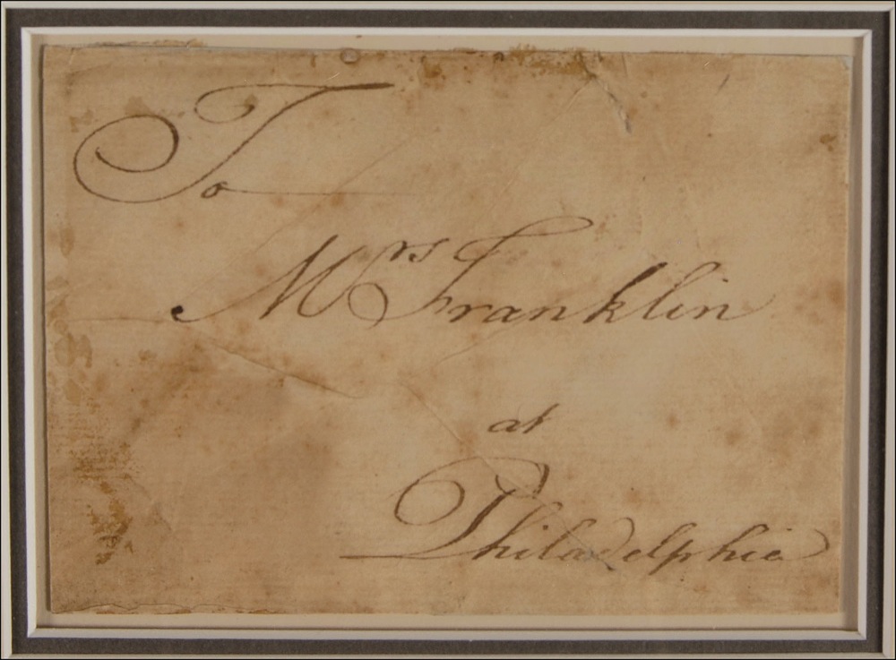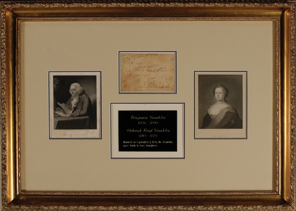 Hand-addressed address leaf, 4.5 x 3, addressed by Franklin, “To Mrs. Franklin at Philadelphia.” Double matted and framed with engraved portraits of Benjamin and Deboarah Franklin and a name plaque, to an overall size of 25 x 18. Scattered creases affecting several words, a few small edge tears, and scattered soiling and toning, otherwise very good condition. Pre-certified PSA/DNA and RR Auction COA.