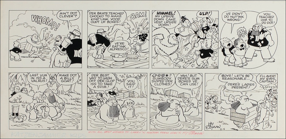 Original hand-inked eight-panel Katzenjammer Kids daily comic strip, dated February 4, 1990 on an off-white 22.5 x 11 piece of artist’s cardstock. Strip depicts a skinny-dipping adventure gone awry. Signed in black ink in the last panel, “Hy Eisman” and signed and inscribed in red artist pencil along the bottom border “With all best wishes to Larry ‘n Marsha from Adri’n. Hy Eisman.” In fine condition. RRAuction COA.