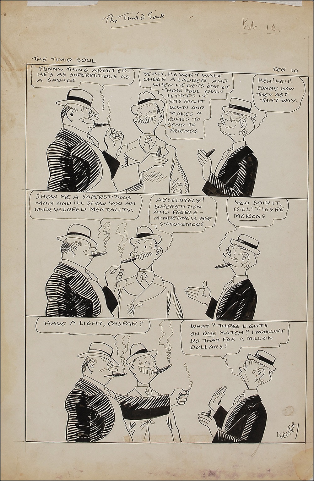 Original hand-inked three-panel The Timid Soul comic strip, dated February 10 [no year] on an off-white 12.75 x 19.75 piece of artist cardstock. The strip depicts three wealthy gentleman discussing superstitions. Signed in black ink on the last panel “Webster.” Mild soiling, scattered toning, and two pieces of mounting tape at the top edge, otherwise fine condition. RRAuction COA.