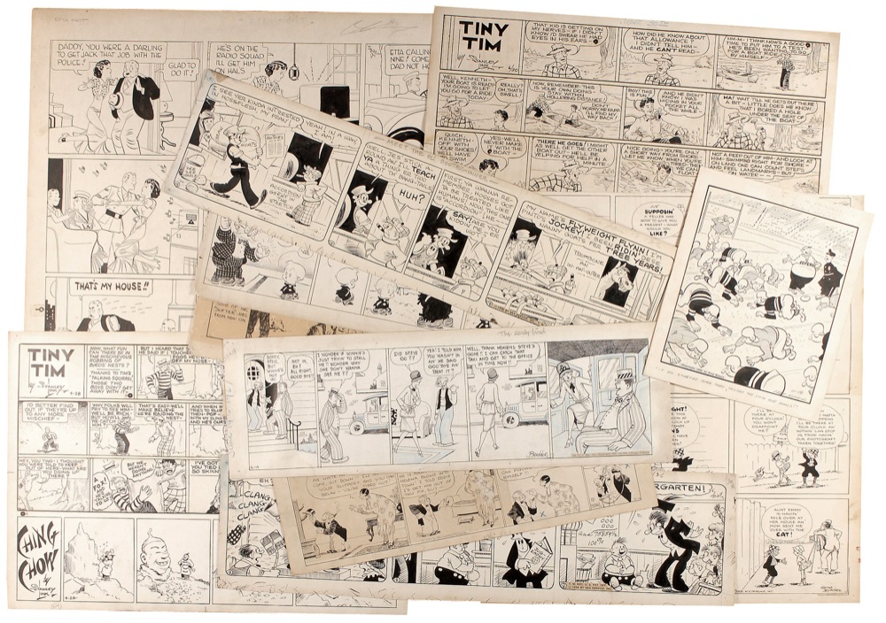 Twelve original hand-inked multi-panel signed daily comic strips on off-white pieces of artist cardstock, ranging in size from 9 x 10.75 to 25.5 x 20.5. Artists are: Martin Branner, Gene Byrnes, Carl Ed, Walter Hoban, Stanley Link (2), Pop Momand, Fred Neher, Paul Robinson, and three others (one unidentified and two by an unidentified artist named Small). In overall very good to fine condition with creasing, toning, soiling, and editorial notations. RRAuction COA.