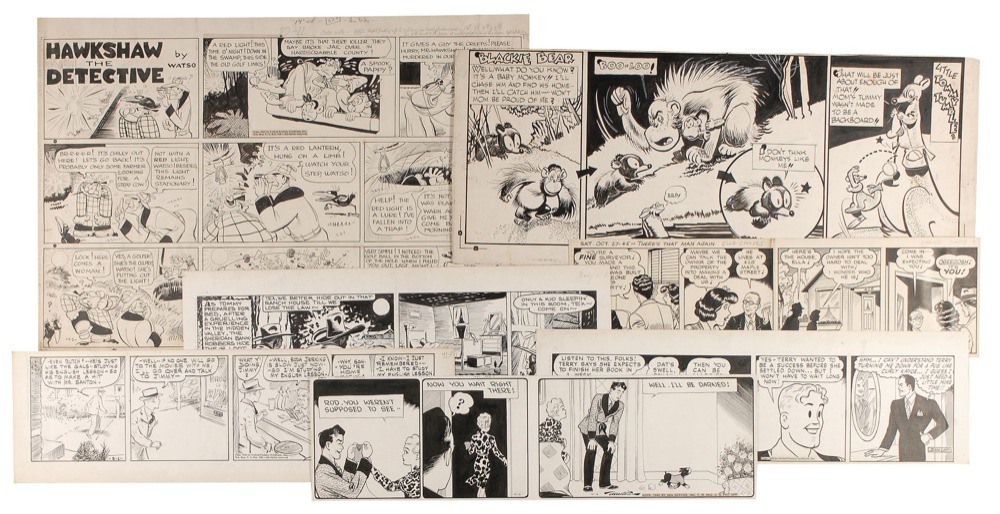 Seven original hand-inked multi-panel daily comic strips on off-white pieces of artist cardstock, ranging in size from 20.75 x 6 to 23.25 x 15.75. Artists are: Robert Brinkerhoff, Sam Leff, Gus Mager, Charlie Plumb, George Scarbo, and two others (”Another Story” and one untitled). In overall very good to fine condition with creasing, toning, soiling, and editorial notations. RRAuction COA.